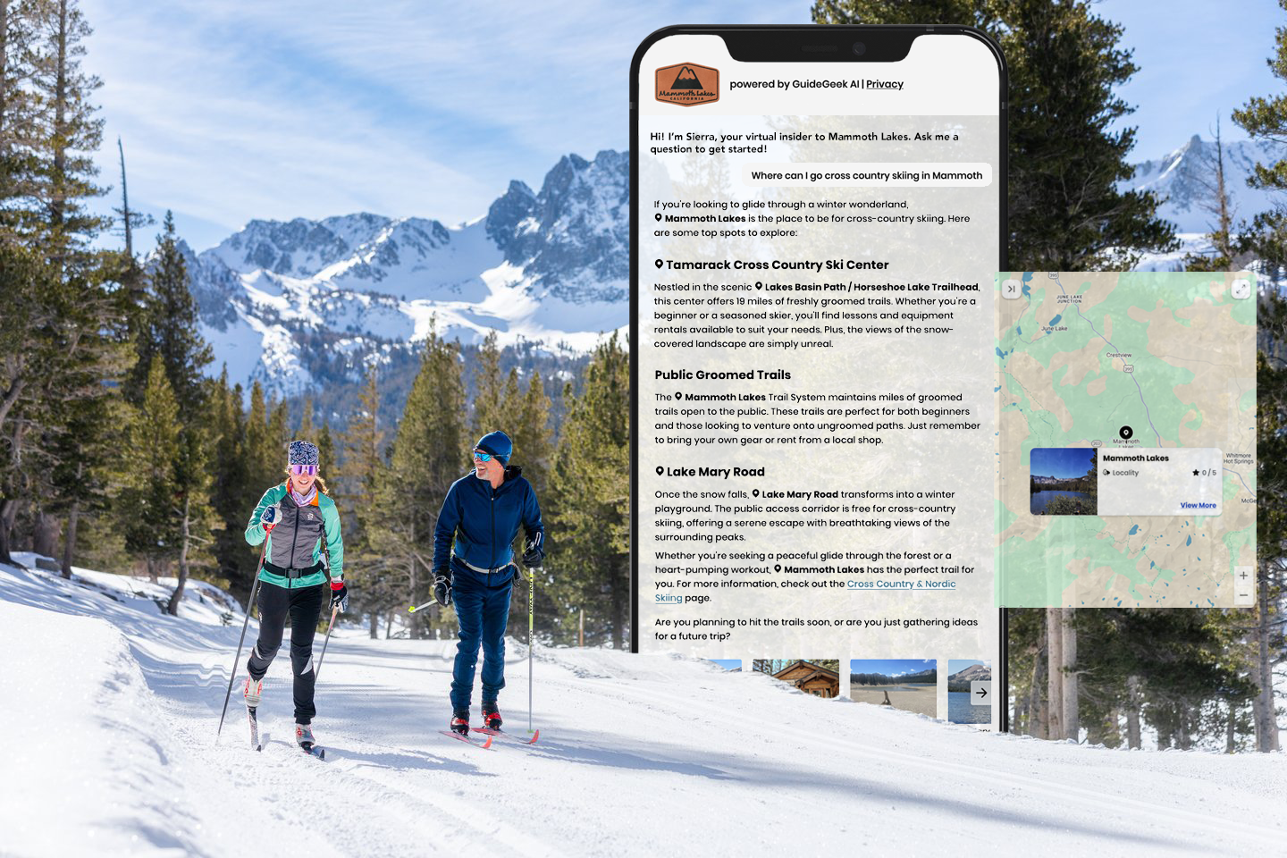 Sierra provides custom travel tips and itineraries in 50 languages, connecting people to local businesses and activities. The personalized, real-time responses are generated by AI trained on extensive data from Mammoth Lakes Tourism, coupled with over 1,000 integrations for travel information from GuideGeek’s award-winning technology.
